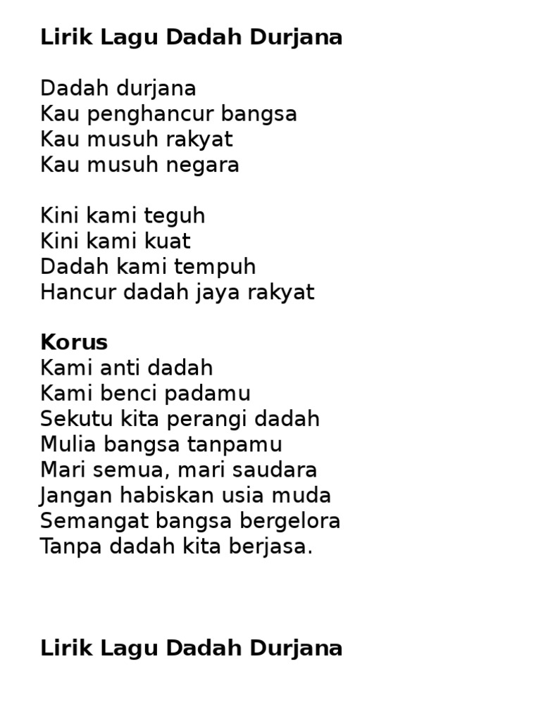 . Lagu Anti Dadah - Dadah DurjanaCredit to. Hancur dadah jaya rakyat KORUS Kami anti dadah. Lirik Lagu Dadah Durjana Dadah durjana Kau penghancur bangsa Kau musuh rakyat Kau musuh negara Kini kami teguh Kini kami kuat Dadah kami tempuh Hancur dadah jaya rakyat Kami anti dadah Kami benci padamu Sekutu kita perangi dadah Mulia bangsa tanpamu Mari semua mari saudara Jangan habiskan usia muda Semangat bangsa bergelora.